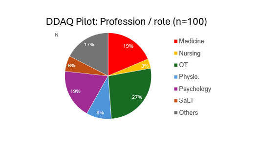 Responses are reported below for the first 100 healthcare staff, of whom 88% were qualified professionals including OTs (26%), psychologists (19%), medical practitioners (19%), physiotherapists (9%) speech & language therapists (6%) and nurses (3%), as llustrated below. The ‘Others’ include other therapy, administrative and assistant staff