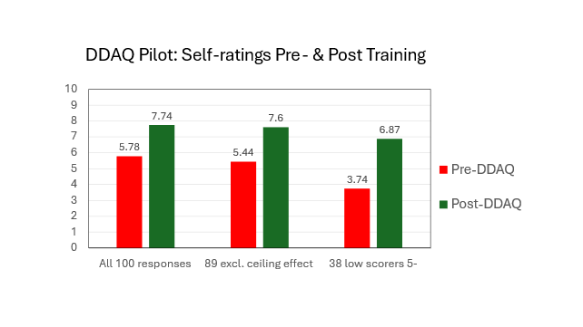 The increase in awareness is illustrated below in the distribution of self-ratings for retrospective pre-DDAQ completion and post-DDAQ training.